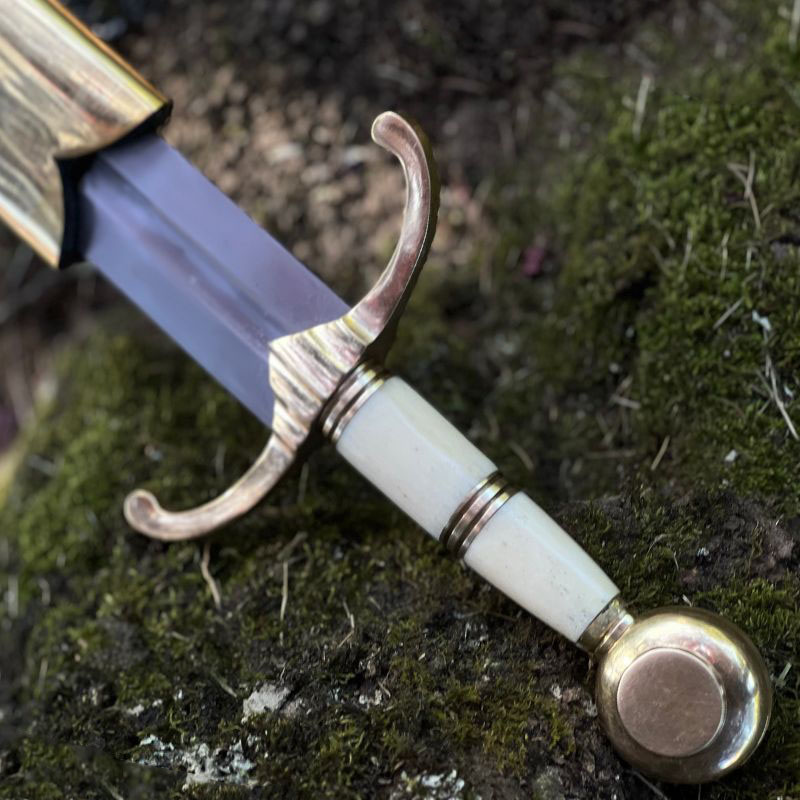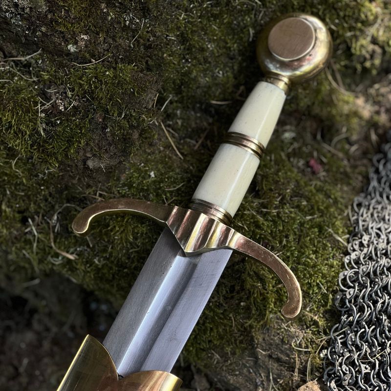 Unsere Replik verfügt über einen kunstvollen Griff aus Knochen. Die Griffbügel, der scheibenförmige Knauf und die charakteristisch nach vorne gebogene Parierstange bestehen aus massivem Messing. Das Schwert wird mit einer Lederscheide geliefert, die mit Mund- und Endblech aus Messing versehen ist.